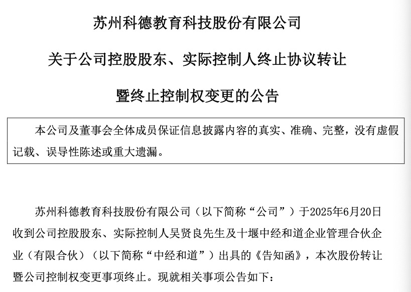 6月20日,苏州科德教育科技股份有限公司(以下简称“科德教育”神牛资讯,300192)发布公告称,公司控股股东、实际控制人吴贤良与十堰中经和道企业管理合伙企业(有限合伙)(以下简称“中经和道”)终止股份转让协议,原计划以14.72元/股、总价11.42亿元转让上市公司7758.43万股股权(占总股本23.57%)的控制权变更事项正式搁浅。