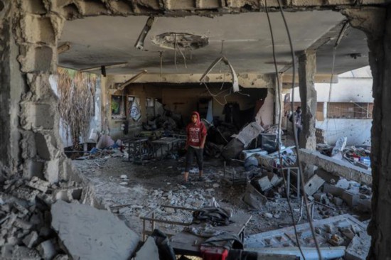 4月25日,在加沙城一所学校,民众查看以军袭击后的废墟。新华社发(里泽克·阿卜杜勒贾瓦德摄)