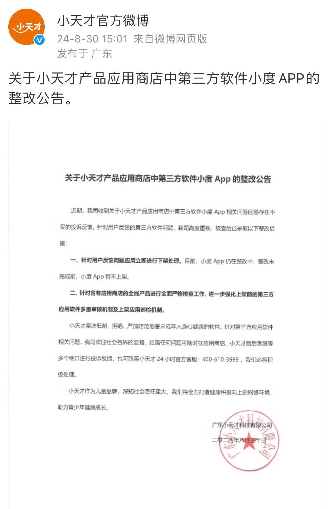 164 2024-09-13 14:19小天才发布整改公告:应用商店已下架第三方软件小度App