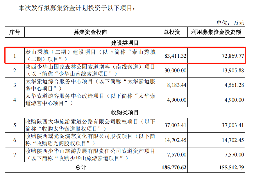 据更新的招股书,陕西旅游本次拟募资15.55亿元,其中逾半数资金(7.29亿元)投向泰山秀城二期项目。公司首次IPO时,曾将泰山秀城一期项目作为募投计划之一,即使首次IPO失败,也仍完成了一期项目。足以证明,该项目承载着公司跨区域复制“华山经验”的野心,以与文旅资源更丰富的“曲江系公司”相竞争。