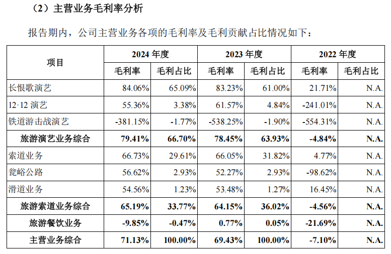《财中社》注意到,其业绩支柱来自两大核心资产:中国首部实景历史舞剧《长恨歌》领衔的旅游演艺板块贡献7.39亿元收入,占总营收59.74%,综合毛利率79.41%;被称作“世界索道建设奇迹”的华山西峰索道及华威滑道等旅游索道业务创收4.56亿元,占比36.85%,综合毛利率65.19%。